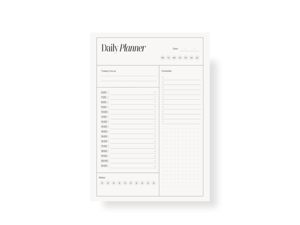 Každá stránka nabízí prostor pro hlavní fokus dne, časový rozvrh, checklist úkolů i poznámky. Nechybí ani jednoduchý přehled pitného režimu, který ti připomene, abys nezapomínala na hydrataci svého těla.