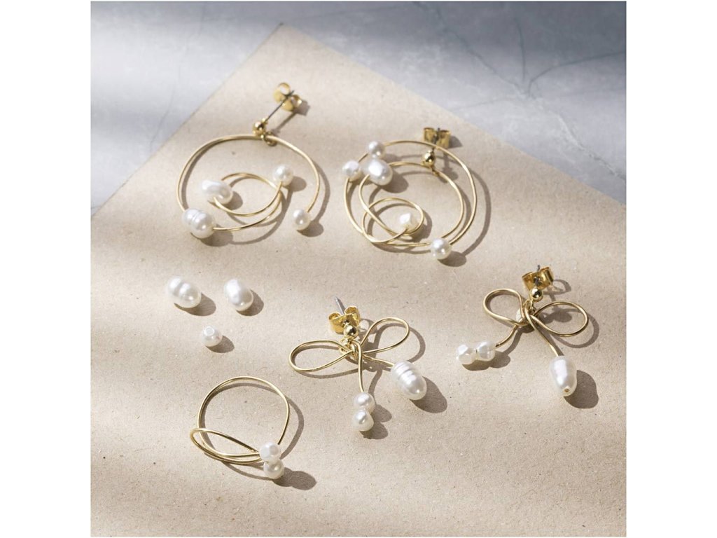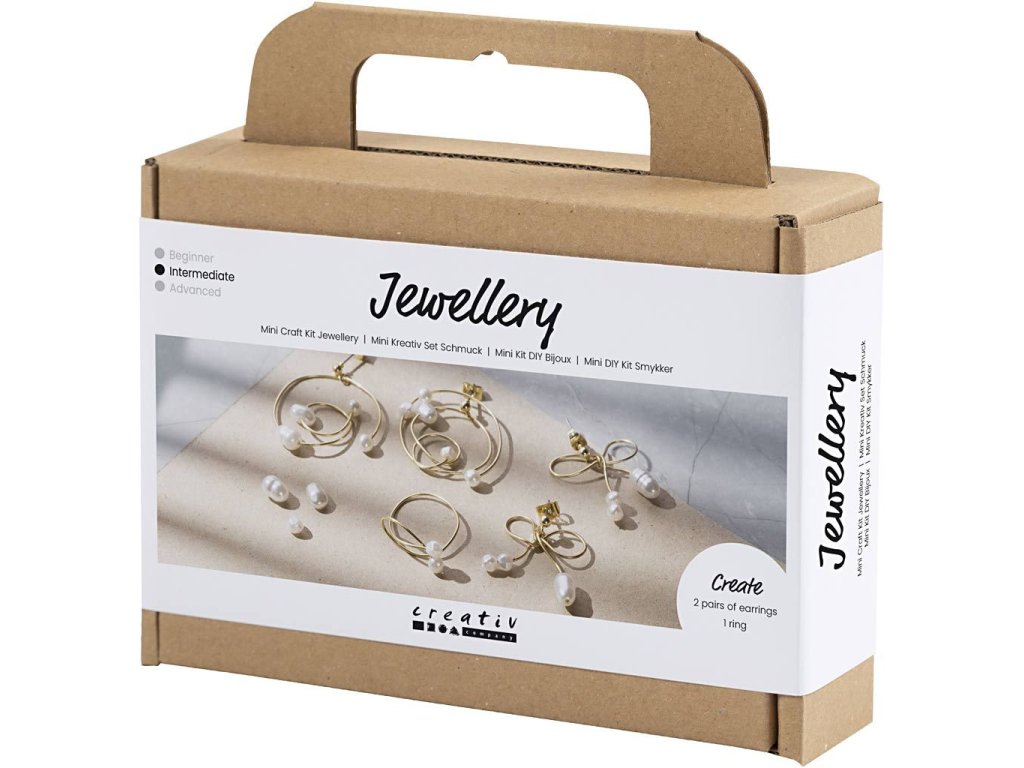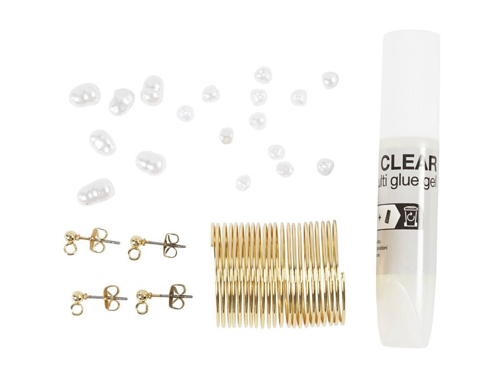 • V sadě najdete šperkařský drátek zlaté barvy, jemné voskové perličky a komponenty k výrobě náušnic a prstenu