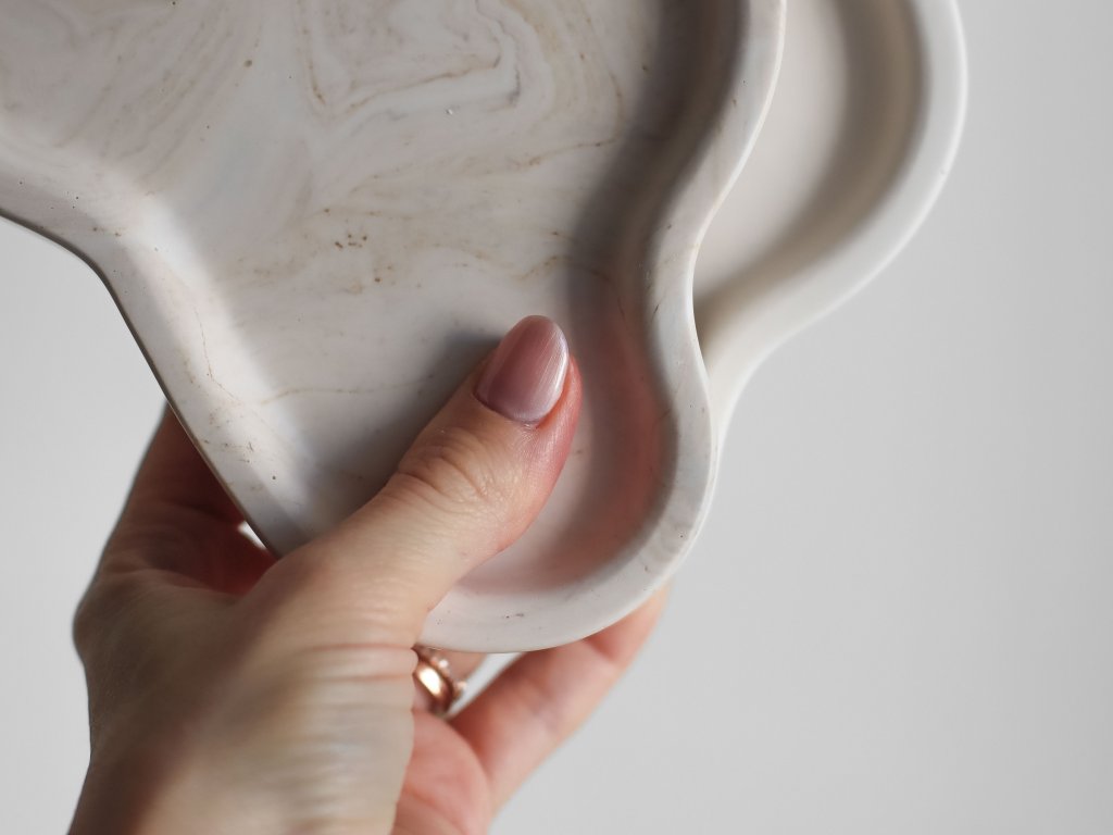 Jemný odkládací tác na šperky s organickým tvarem, navržený pro malé každodenní rituály.